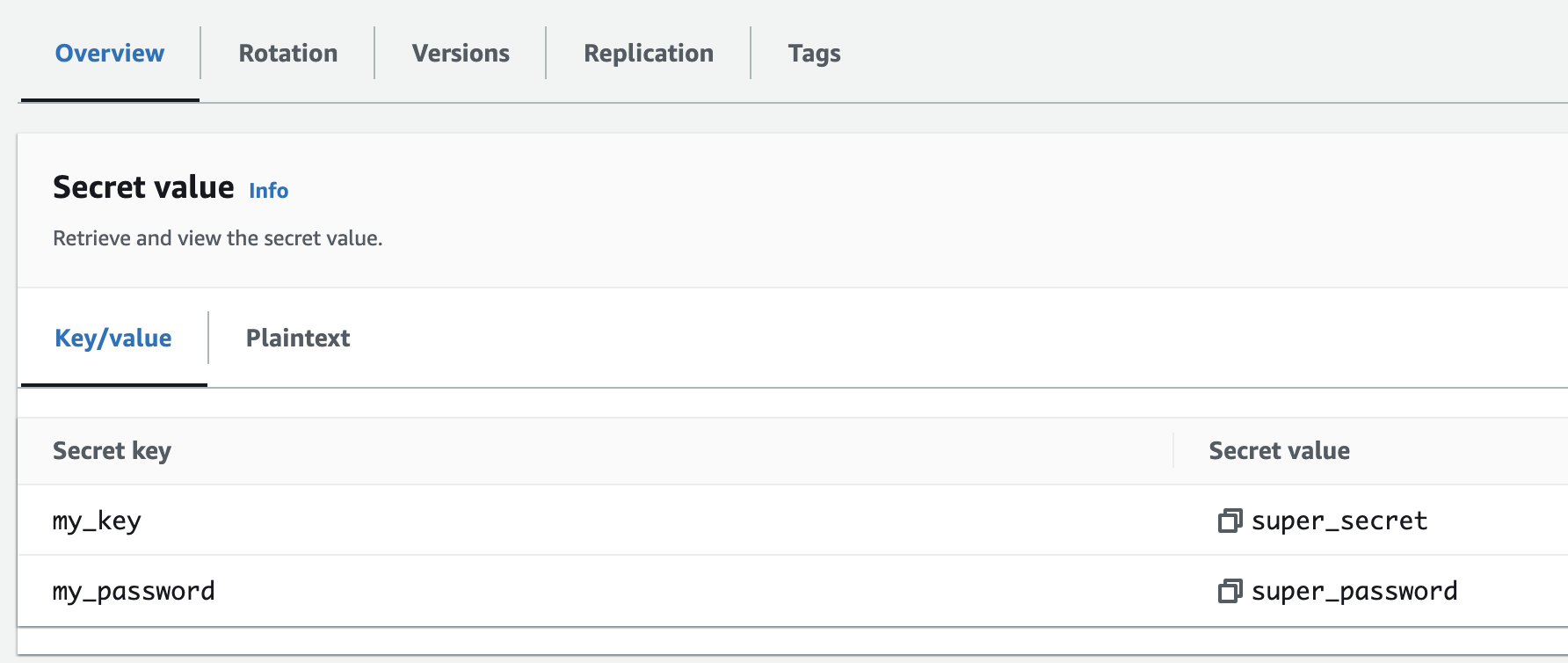 The store reads keys from the secret named in the selector. In the above example my_secret_name must be defined in AWS Secrets Manager, and any keys referenced using ${aws:my_key} will look for a key my_key within my_secret_name.