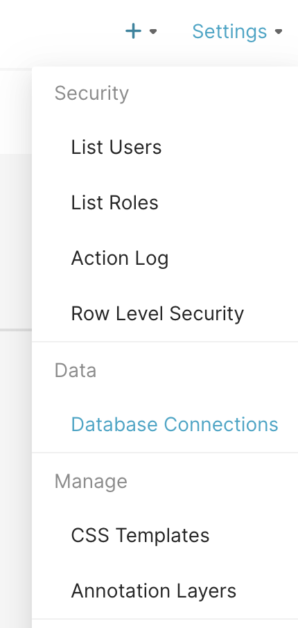 Hover over the Settings menu and select Database Connections.